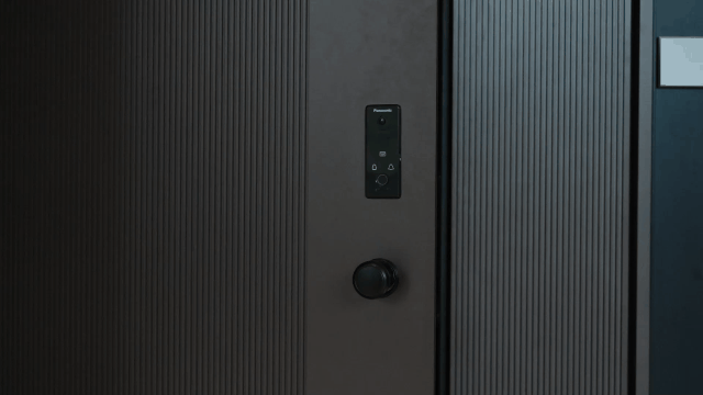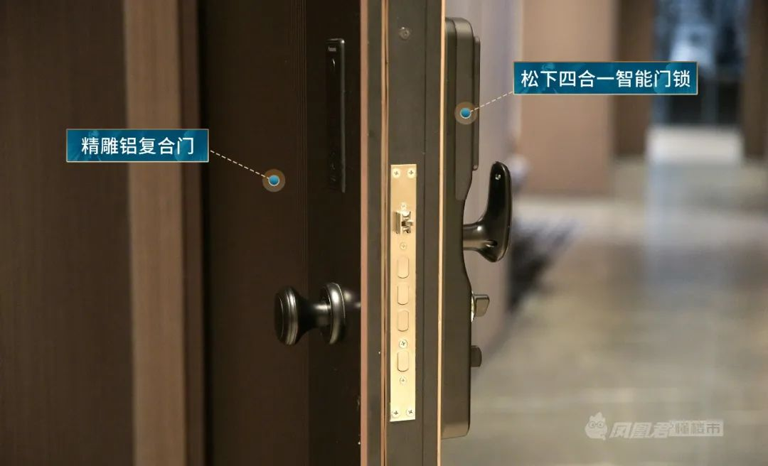 门上配以内嵌设计的松下四合一智能门锁,照顾每一种归家方式。门锁整体采用分离式设计,和门的贴合度更高,面板铝精雕材质,美观大气。