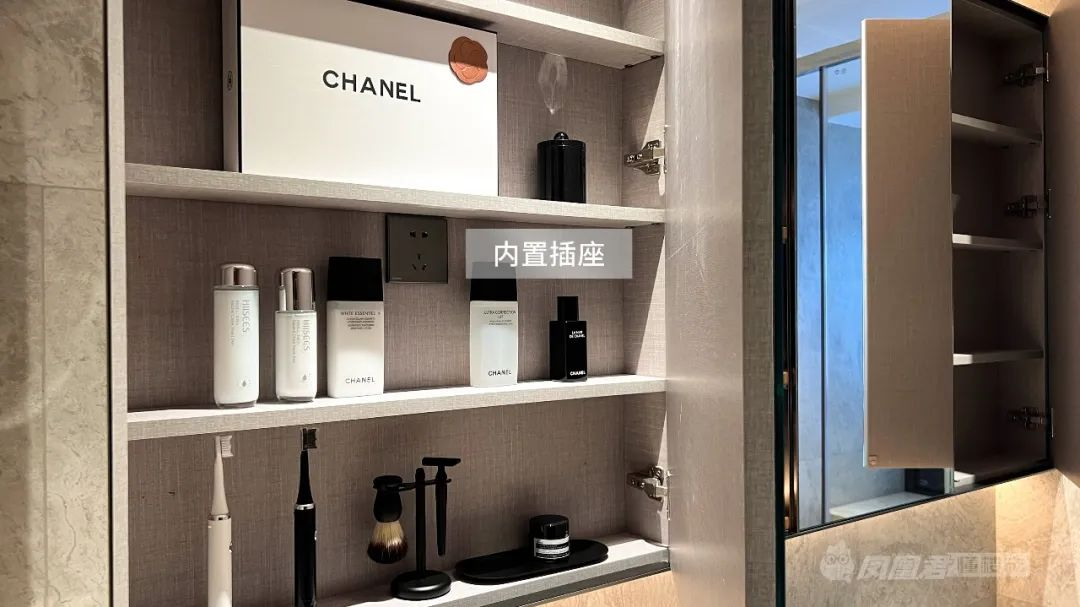 镜柜内全部设置活动层板、置物凹龛、采用台下盆防止台盆边的积水、洗手台边缘5mm凸起挡水、墙身设置简洁耐用的石材层板壁龛……每一个细节设计,都能看出城市溪谷的用心。