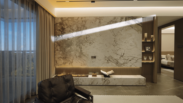 电视背景墙面作为起居空间中少有的装饰元素,采用定制岩板,纹理独一无二,简约流畅的花纹凸显层次,品质感与设计感的平衡信手拈来。
