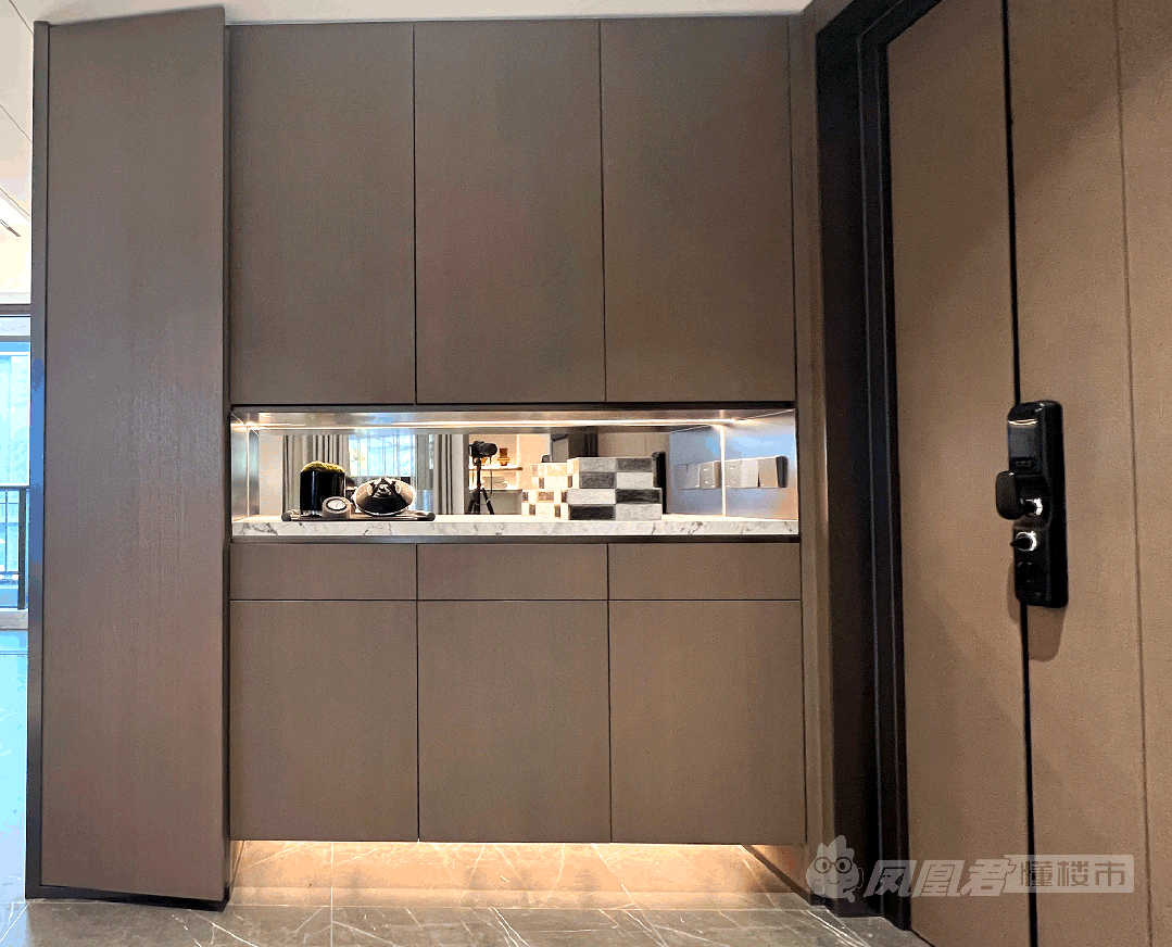 高柜门板内配置全身镜,预装灯带,方便业主出门归家时整理仪容,细节无处不在。